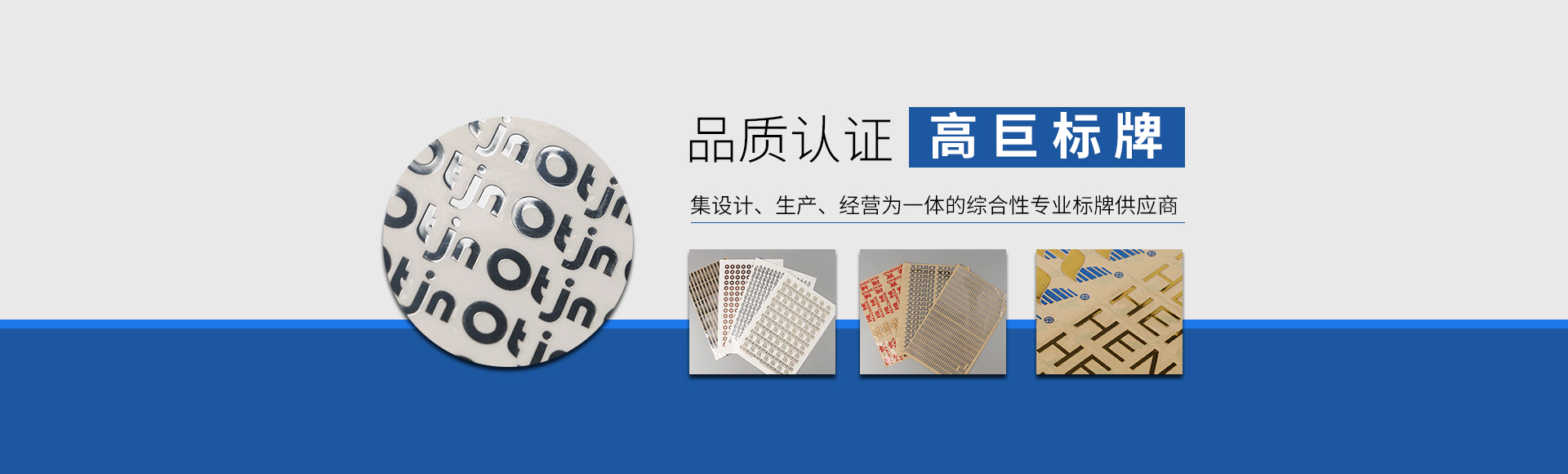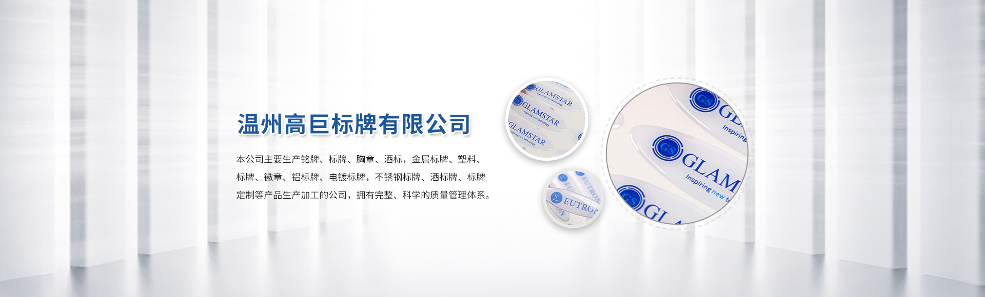溫州高巨標牌有限公司,位于浙江省溫州市蒼南縣金鄉鎮,現有員工35人,公司擁有行業內完整的產業鏈(模具從自由設計無形到有形、拋光、拉絲、涂布、曬版、曝光、顯影、電鍍、脫模、上膠、組合、模切、激光上色UV印刷、絲印移印,組裝、檢查包裝)。標牌廠家主要產品:標牌、銘牌、標牌、水晶標、標牌定制、標牌銘牌,各種材質LOGO標志定制、電鍍銅鎳分體標、鴛片金屬LOGO、PET電鍍金屬分體LOGO、車標車貼、彩色感壓水晶分體標(萬能貼)等各類標牌銘牌。溫州高巨標牌有限公司擁有完整、科學的質量管理體系,以誠信、實力和產品質量獲得業界的認可,并且以中國知名品牌企業合作、如安徽美的、中國楊子、廣州奧馬、山東海信、浙江華美,產品用于廣泛,電器、酒廠包裝、茶葉包裝、禮品盒包裝、家具銘牌、門業銘牌、箱包銘牌、各個行業標志LOG0牌定制,歡迎各界朋友蒞臨參觀、指導和業務洽談。